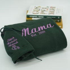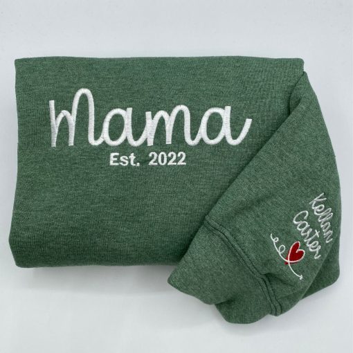 Personalized Mama sweatshirt and hoodie featuring custom kid names embroidered on the sleeve alongside the Est year. This custom embroidered sweatshirt is an ideal new mom gift, celebrating motherhood with a stylish and cozy keepsake. Crafted from soft, high-quality fabric for everyday comfort, it’s perfect for new moms wanting a unique, personalized touch. Order your personalized Mama sweatshirt today for a meaningful and lasting gift.